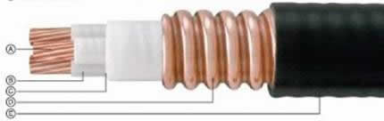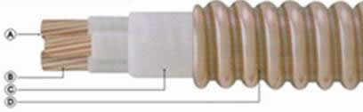 A. 導(dǎo)體:絞合銅導(dǎo)體;B. 絕緣:合成云母帶;C. 填充:無(wú)機(jī)材料;D. 銅套:縱包焊接并軋紋