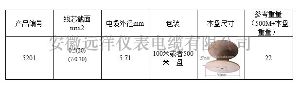 線芯截面(mm2):0.5(20)、(7/0.30) 產(chǎn)品編碼:5201 對數(shù):1 電纜外徑:5.71 參考重量: 41 KG/KM